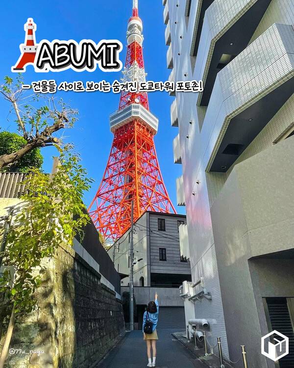 숨겨진 도쿄타워 포토존 ABUMI입니다. 이 곳은 정확히는 설명할 수 는 없지만 도쿄타워 근방의 건물 사이 포토존인데요. 건물 사이라 살짝 가려지는 건 아쉽지만 도쿄 타워와 함께 푸른하늘 남기기 좋은 도쿄타워 포토존입니다.