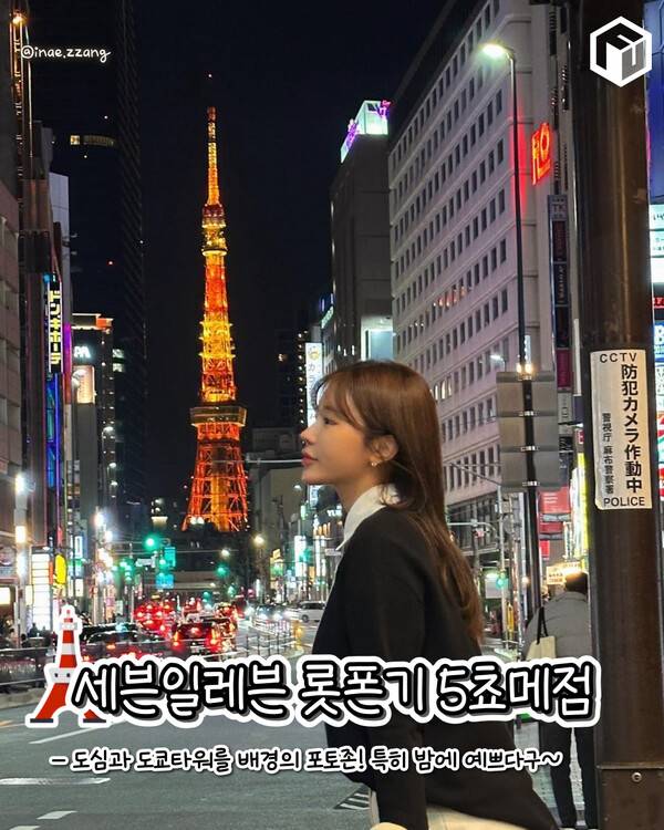 마지막으로 소개해드릴 도쿄타워 포토존은 바로 세븐일레븐 롯폰기 5쵸메점입니다. 이 곳은 고층 건물들 사이로 보이는 도쿄타워가 매력적인데요. 특히 밤에 가시면 불이 켜진 도쿄타워와 함께 거리 조명들로 사진을 남기실 수 있어 야간에 가시는 것을 추천드립니다.