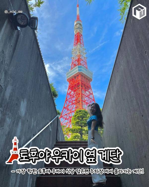 최근 가장 핫하다는 토후야 우카이 옆 계단 포토존입니다. 토후야 우카이 식당 맞은편 주차장에서 올라가는 계단에 있는 이 포토존은 숨겨진 포토존으로 로우앵글로 찍으면 도쿄 타워를 한 프레임에 담을 수 있어 인기있는 포토존인데요. 인기가 있는 포토존임으로 이른 아침 방문하시면 기다리는 줄없이 사진을 남기실 수 있으실 겁니다.