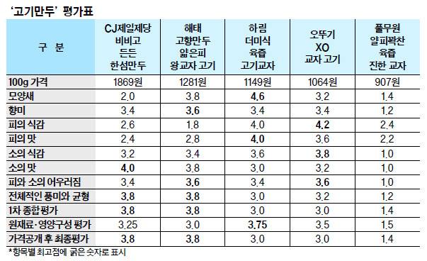 이번 평가에서는 공동 순위가 두 차례 등장했다. 공동 1위와 공동 3위가 나란히 나오면서 K만두가 ‘상향평준화’됐다는 게 새삼 확인됐다. 공동 1위는 해태 ‘고향만두 얇은피 왕교자 고기’와 CJ제일제당 ‘비비고 한섬 든든만두’(이상 3.8점)가 나란히 차지했다.