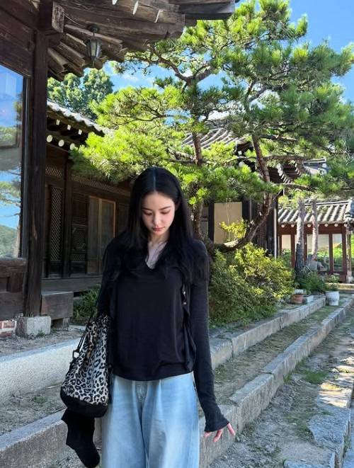 자칫 단조로울 수 있는 코디에 큰 숄더백으로 마무리. 분위기를 살려요.