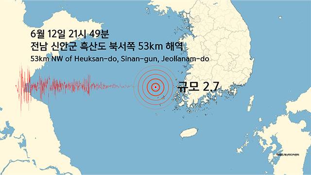 오늘(12일) 밤 9시 49분에 전남 신안군 흑산도 먼 해역에서 규모 2.7의 지진이 발생했습니다.