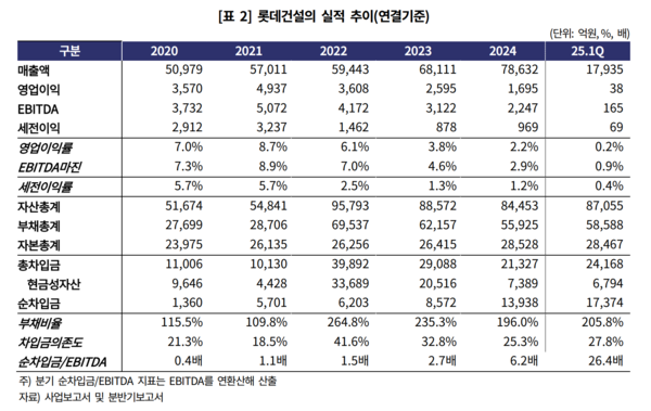 또 PF 유동화증권 매입 재원을 차입으로 확보한 만큼 금융비용 부담이 큰 상태다. 부채비율은 2021년 말 109.8%에서 2022년 말 264.8%로 급증한 뒤 올 1분기 말 205.8%를 기록했다. 롯데건설은 본PF 전환과 분양수익을 통한 상환으로 올해 말까지 PF 우발채무를 2조원 중반대로 축소할 계획이다.