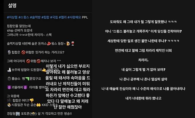 방송 내용 뿐 아니라 설명글에도 선 넘은 조롱이 이어지자 스윙스는 "도와줘도 왜 그래. 내가 뭘 그렇게 잘못했냐. 아니 '스윙스 불러놓고 개쪽 주자' 이게 당신들 전략이야? 세상한테 당한 일로 생긴 불만 나한테 푸냐?"라며 분노했다.