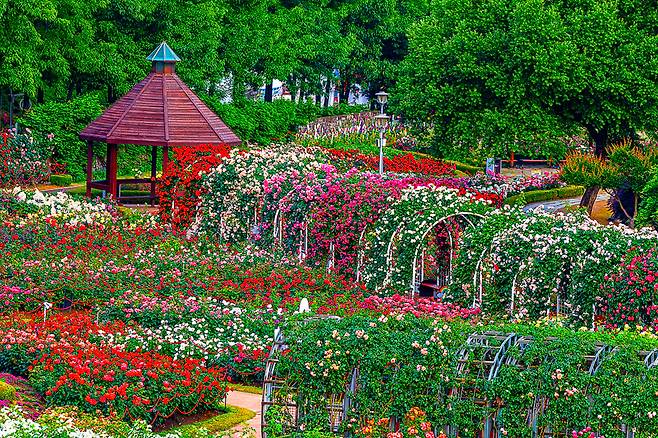 장미 정원 곳곳에는 아름다운 산책로가 조성되어 있다. 각기 다른 테마로 꾸며진 정원을 걷다 보면 자연스럽게 이어지는 꽃길을 따라 수백만 송이의 장미가 피어 있다.