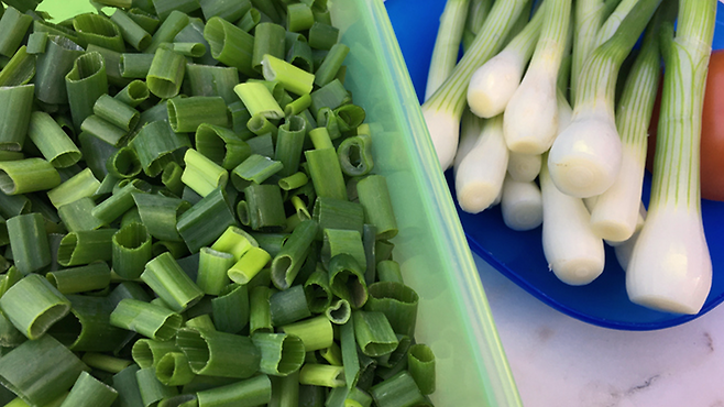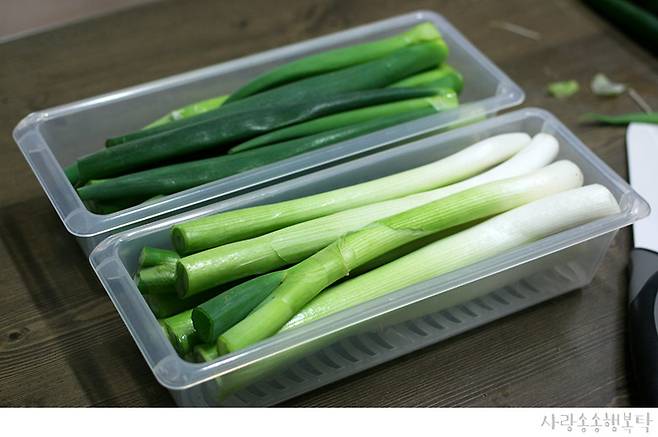 흰 부분은 앞서 소개한 세로 보관 방식으로 냉장 보관하면 3개월 이상도 무리 없다. 반면 잎 부분은 송송 썰어 밀폐 용기에 담아 냉동 보관하는 것이 좋다.