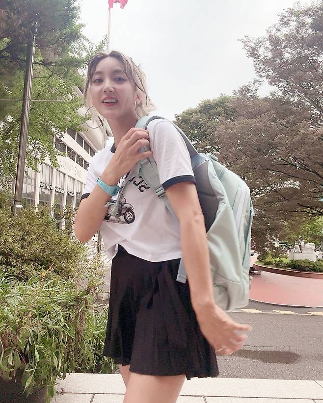 바다가 선보인 첫 번째 스타일은 학생다운 캠퍼스 룩이다. 흰색 티셔츠에 검은색 플리츠 스커트를 매치한 단정한 스타일로 청량한 분위기를 연출하고 있다. 민트색 손목 액세서리와 민트 계열의 백팩으로 포인트를 주어 전체적인 스타일에 생기를 더했다. 자연스럽게 흐트러진 헤어스타일은 캐주얼한 느낌을 강조하며, 교복을 연상시키는 이 스타일은 바다의 발랄한 매력을 십분 발휘하고 있다.