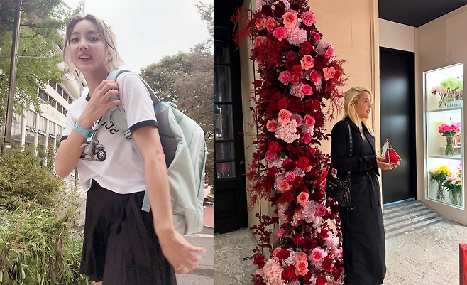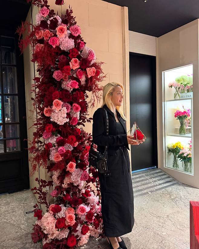 세 번째 스타일에서는 블랙 롱코트를 착용한 모습이 인상적이다. 화려한 핑크와 레드 계열의 꽃 장식 벽면을 배경으로, 미니멀한 블랙 코트는 강렬한 대비를 이루며 시선을 사로잡는다. 어깨에 걸친 블랙 숄더백과 전체적인 모노톤 스타일링은 세련된 도시 여성의 이미지를 완성하고 있다. 꽃과 블랙의 조화는 바다의 다채로운 매력을 효과적으로 표현하고 있다.