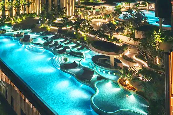 동남아 분위기가 물씬 풍기고 있어 여행 온 느낌을 만끽할 수 있죠. 수영장 규모가 크기 때문에 지루할 틈 없이 놀기에도 좋습니다.