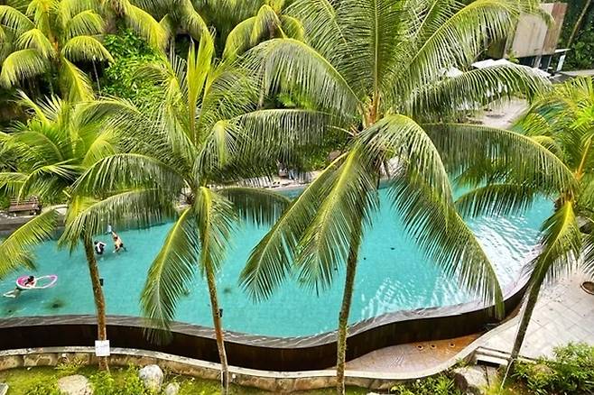 열대 나무 사이로 보이는 청량한 수영장은 투숙객들 사이에서 인기가 높습니다.