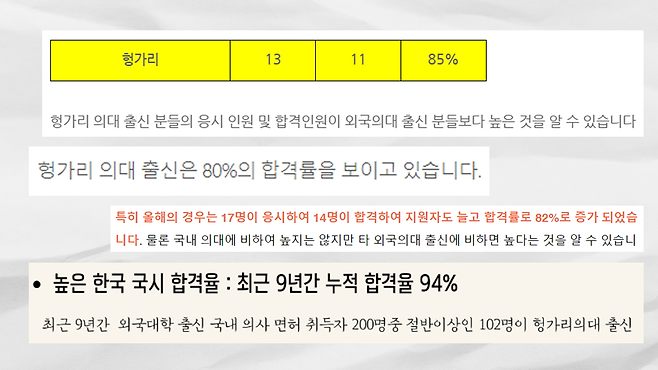 그런데 최근 헝가리 의대 출신의 국시 합격률이 85%에 육박한다는 보도가 나왔습니다. 국내 의대 출신 합격률이 95% 정도니까, 그렇게 차이가 크지 않습니다. 자연히 합격률 통계는 외국 의대 준비 과정을 운영하고 있는 학원들의 광고 문구로 활용되고 있습니다. 사실은팀이 학원 광고들을 확인해보니, 국시 합격률과 관련한 홍보 문구를 꽤 많이 발견할 수 있었습니다. 국시 합격률이 이렇게 높다, 그러니 안심하고 준비하라는 뜻으로 읽힙니다.