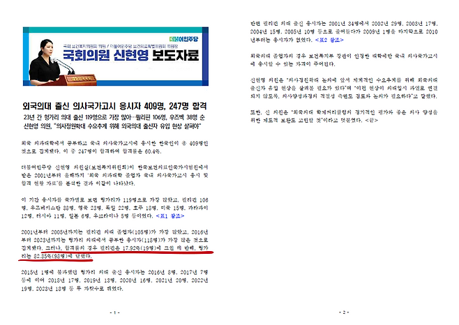 앞서 민주당 신현영 의원실도 비슷한 자료를 냈습니다. 전산화 이후 집계 가능 시기 기준(2011년 이후)으로 기간을 넓혀 따져봐 분석했는데, 헝가리 의대 출신의 국시 합격률이 82.4%에 달했다는 내용입니다.