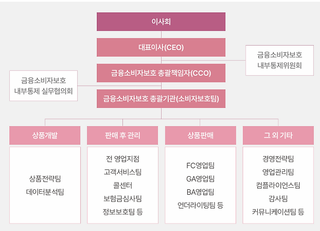 이를 뒷받침하기 위해 조직체계도 손질했다. 금융소비자보호 조직을 운영하며 총괄책임자(CCO)를 중심으로 상품본부장, 보험대리점(GA)본부장, 방카슈랑스(BA)본부장, 준법감시인 등이 참여하는 내부통제위원회를 만들었다. 소비자 불만 처리와 접근성 강화를 위해 서울·부산 등에 고객플라자도 마련했다.