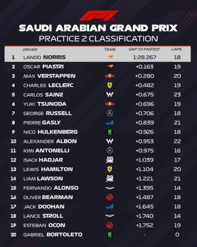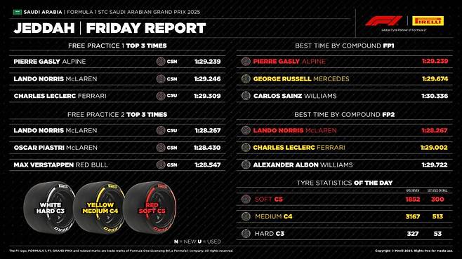사우디아라비아 그랑프리 연습 주행 첫날, 맥라렌이 선두를 차지했습니다. 특히 FP2에서 노리스는 1분 28초 267, 피아스트리는 1분 28초 430을 기록하며 압도적인 페이스를 선보였습니다. 이는 작년 같은 세션에서 알론소가 기록한 랩타임보다 0.1초 이상 빠른 기록이며, 올해 피렐리가 공급한 타이어가 작년보다 한 단계 더 부드러운 C4 컴파운드라는 점을 감안하면 더욱 놀라운 결과입니다.