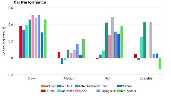 맥라렌을 기준으로 중속 코너에서는 레드불과 메르세데스가, 고속 코너에서는 페라리가 더 빠른 것으로 분석되었습니다. 특히 직선 구간에서는 자우버가 무려 0.15초나 더 빠른 속도를 기록하며 놀라움을 자아냈습니다. 😲