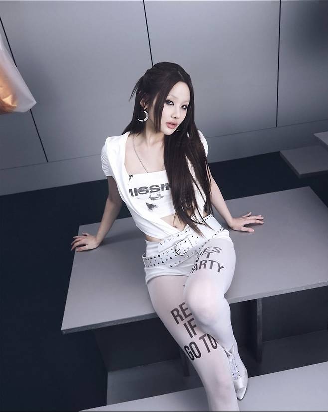 화이트를 베이스로 한 이번 룩은 메시지 프린팅이 강렬한 존재감을 발휘했으며, 도발적 문구가 프린트된 타이즈는 단순한 의상을 넘어 시대를 비추는 아이콘처럼 기능해 Y2K 키치 무드를 극대화했습니다.