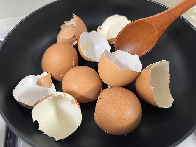 계란 껍질은 겉면의 오염물, 이물질, 미세한 단백질 찌꺼기를 제거하고 세척합니다. 팬에 볶거나 끓는 물에 충분히 데쳐서 소독하세요. 그리고 완전히 말려줍니다.
