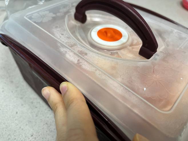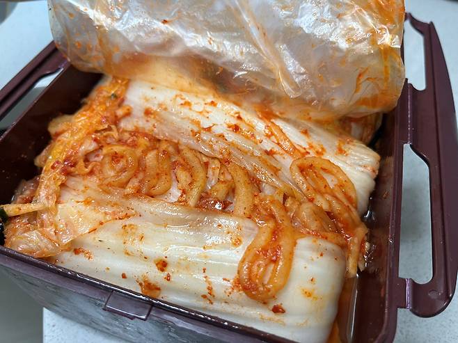 김치통은 그냥 닫아두지 마시고 반드시 위에 비닐을 덮어 보관하세요. 그래야 공기 접촉이 줄어들고 산패 속도가 느려집니다.