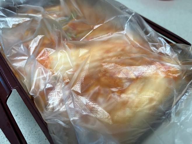 김치 먹을 때는 비닐을 완전히 걷지 말고 조금만 들춰서 김치를 꺼내세요. 김치 꺼낼 때 비닐을 매번 완전히 벗기면 공기가 한꺼번에 들어가서 김치가 빠르게 변합니다.