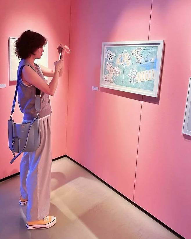 고은아는 슬리브리스 니트 톱과 와이드 팬츠로 미니멀하면서도 세련된 분위기를 연출하고 있다. 톤온톤의 연그레이 컬러와 심플한 디자인이 전시장의 핑크빛 벽면과 조화를 이루며, 크로스백과 스니커즈로 실용성과 편안함을 동시에 잡았다. 전체적으로 절제된 스타일링이 돋보인다.