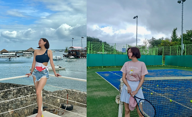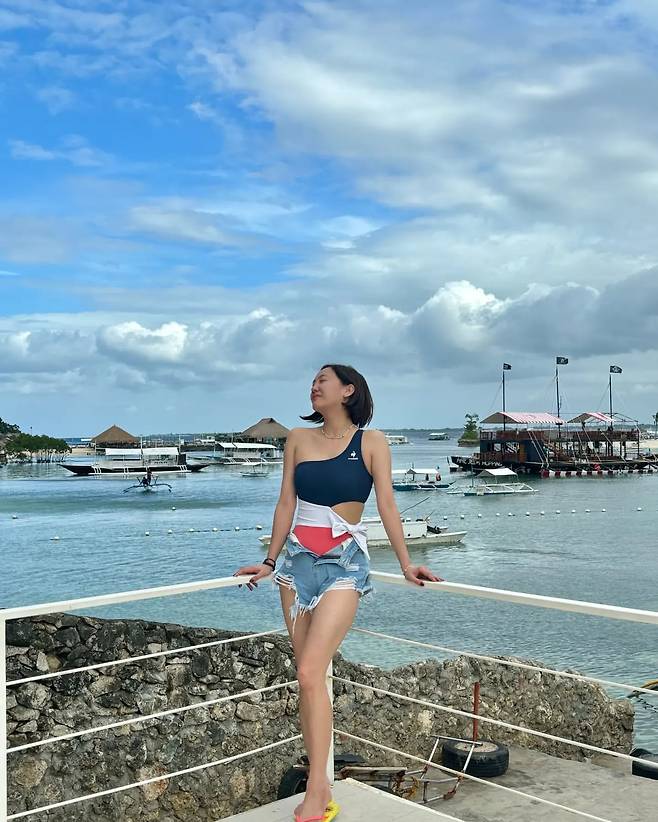 해변에서는 원숄더 컷아웃 수영복과 데님 숏팬츠를 매치해 트렌디한 리조트룩을 완성했다. 네이비, 화이트, 핑크 컬러 블록이 시원한 분위기를 자아내며, 자연스럽게 흘러내리는 헤어스타일과 미니멀한 액세서리가 청량한 여름 감성을 강조한다