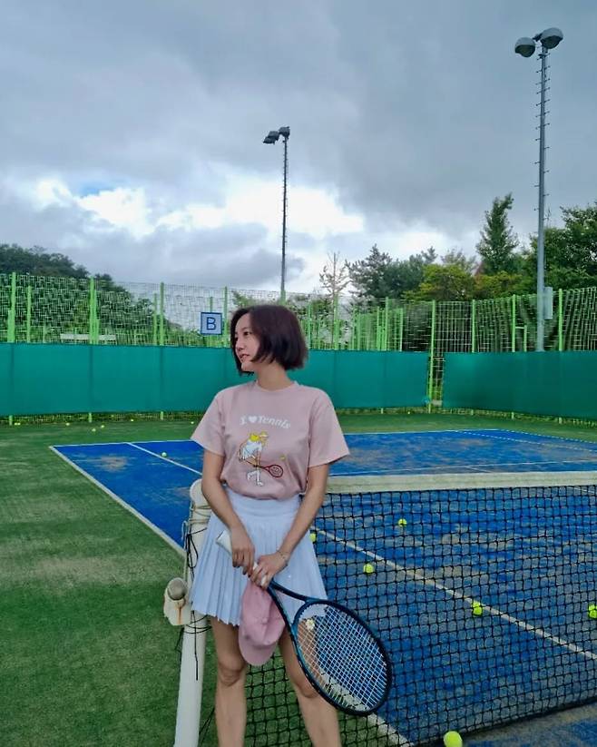 테니스 코트에서는 ‘I ♥ Tennis’ 프린트 티셔츠와 플리츠 미니스커트로 경쾌한 스포츠룩을 선보였다. 라켓과 볼캡, 그리고 운동화까지 갖춘 완벽한 테니스 무드가 인상적이다. 파스텔 핑크와 화이트 조합이 상큼한 에너지를 더한다