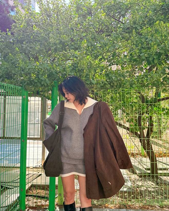 도심의 가을 풍경 속에서는 니트 원피스와 브라운 재킷을 매치해 따뜻한 계절감을 드러냈다. 오버사이즈 재킷과 무릎까지 오는 부츠, 그리고 크로스백의 조합이 편안하면서도 스타일리시한 가을 패션을 연출한다. 내추럴한 헤어와 미니멀한 메이크업이 전체 분위기를 한층 부드럽게 만든다