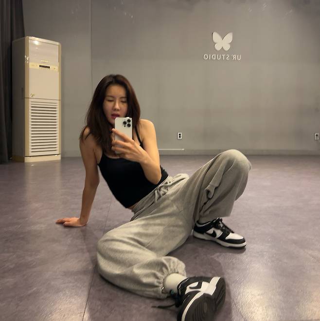 정아는 댄스 스튜디오 바닥에 편안히 기대 앉아, 블랙 슬리브리스와 그레이 조거팬츠, 블랙&화이트 스니커즈로 완성한 이지 스트리트 무드를 보여주었어요.