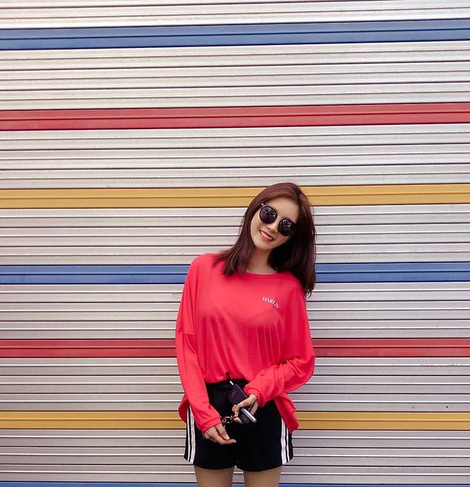 레드 롱슬리브 티셔츠와 블랙 쇼츠를 매치한 모습은 컬러 대비가 강렬하면서도 산뜻했어요.