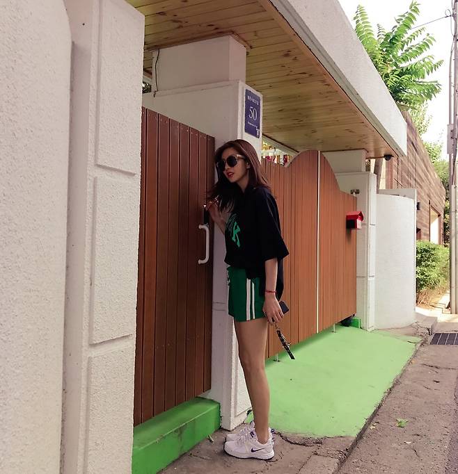 다른 컷에서는 그린 라인 쇼츠와 루즈핏 블랙 티셔츠, 화이트 러닝화를 매치해 한층 경쾌한 에너지를 더했어요.
