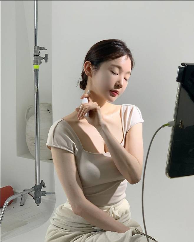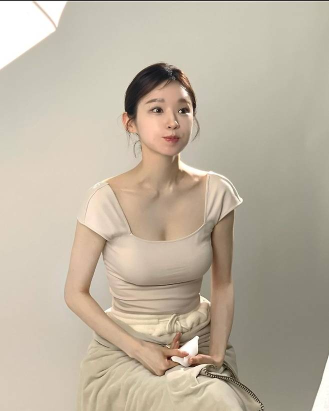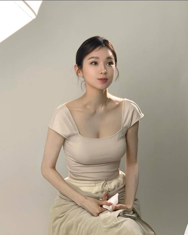 강민경은 베이지 스퀘어넥 티셔츠를 착용해 세련되고 우아한 이미지를 자랑했습니다.