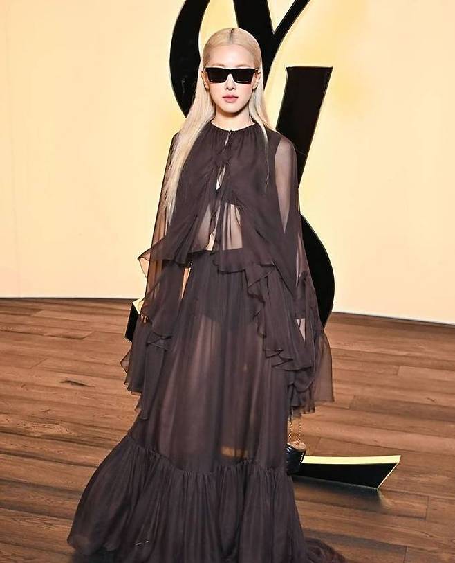 2. 블랙핑크 로제는 생 로랑 패션쇼에 로제는 러플 디테일의 하늘거리는 브라운 드레스룩으로 등장과 동시에 현지 팬들의 열띤 환호를 받았다.