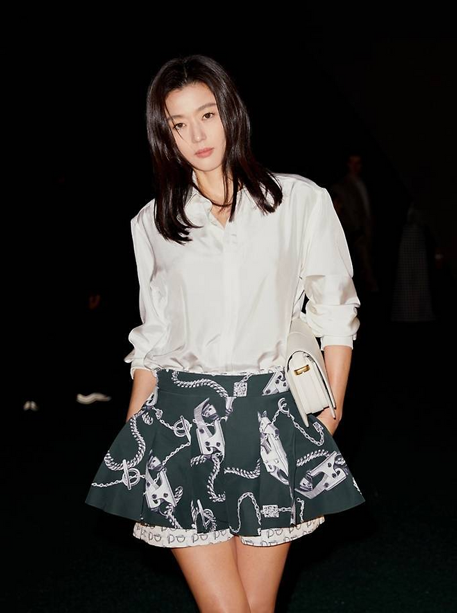 10.배우 전지현은 버버리 2024 F/W 패션쇼에 심플한 화이트 셔츠와 유니크한 프린트 미니 스커트를 매치한 현대적인 감성의 미니멀룩이 시크한 멋을 발산했다.