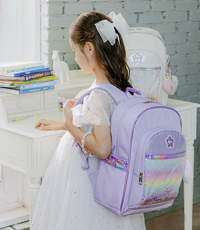 여자 아이들은 대체로 분홍색, 보라색 등 밝은 파스텔톤 가방을 선호한다. 요즘에는 가방에 키링을 달거나 앞주머니에 인형 등 귀여운 아이템을 넣는 것이 유행이기 때문에, 알록달록한 키링이나 투명 포켓이 포함된 제품을 추천한다. 반짝이는 글리터까지 들어가 있으면 금상첨화. 책가방만 하면 4~6만 원대, 보조 가방과 세트로 구매할 경우 10만 원 내외로 구매할 수 있다.