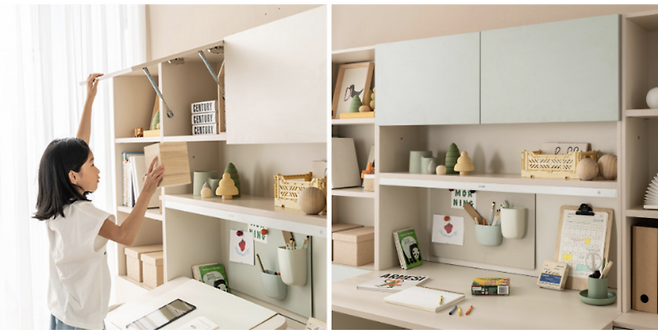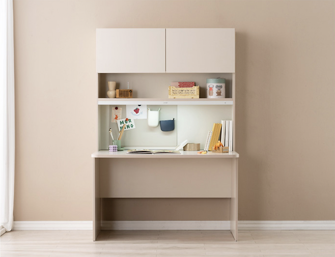 리바트 온라인 로넌 플랩도어형 전면책상은 전면의 책장과 책상이 일체형으로 구성되어 있는 책상이다. 유해물질 걱정 없는 E0보드를 사용하였으며, 책상 모서리가 라운드 처리되어 다칠 염려가 없다. 책장 상단에는 플랩도어가 달려 있어 책상을 깔끔하게 정리할 수 있고, 플랩도어 색상은 아이보리, 민트, 핑크 중에서 선택이 가능하다. 가격 대비 만듦새가 훌륭하고 책장까지 구성되어 있어 초등학교에 올라가는 아이들의 첫 공부 책상으로 추천한다.