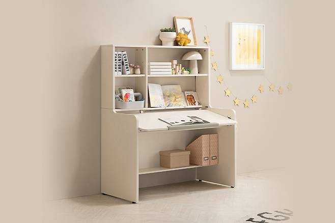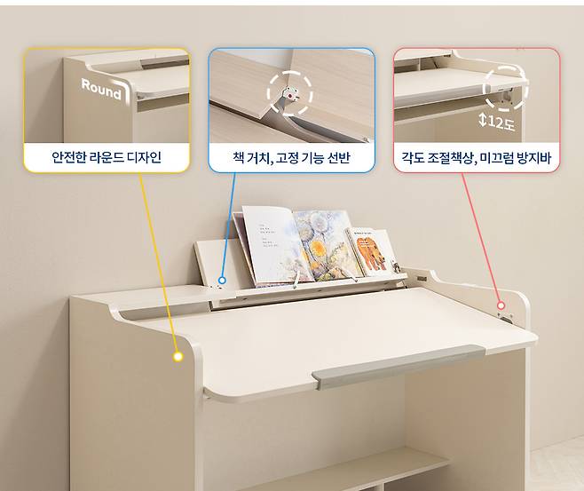 리바트 온라인 꼼므 어린이 각도조절책상세트는 12도까지 각도 조절이 가능한 어린이 책상이다. 평평하게 눕힌 상태에서는 그림을 그리거나 만들기 등 창작 활동을 하기 좋고, 12도로 세운 상태에서는 책을 읽거나 글씨를 쓰기 좋다. 아이들이 책상 앞에 더 편한 자세로 오래 앉아 있을 수 있으며, 올바른 자세를 유지하는 데에도 도움이 되는 기능성 제품. 또한 상판 끝에 PVC 받침대가 있어 상판을 세워도 책이 미끄러지지 않고, 선반에는 책을 펼쳐둔 상태로 고정할 수 있는 거치대도 적용되어 있다. 각도조절 책상과 상부 책장이 한 세트로 구성되어 있으며, 하부에 있는 수납장에도 가방 등 여러 가지 물건을 넣을 수 있어 방 정리에 유용하다.