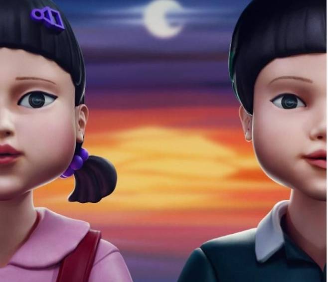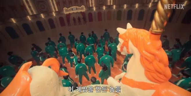 저마다의 절박한 사연을 가진 456명의 참가자들이 목숨을 걸고 게임에 나서는 넷플릭스 오리지널 시리즈 '오징어 게임'은 그 무자비함과 대비되는 알록달록하고 따뜻한 색감의 배경과 리코더 등 동심을 드러내는 악기를 활용한 음악으로 기괴함을 더했다.