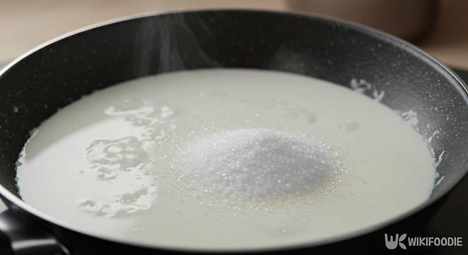 1. 프라이팬에 우유 600ml와 설탕 170g을 넣고 중약불에서 저어 녹인다.