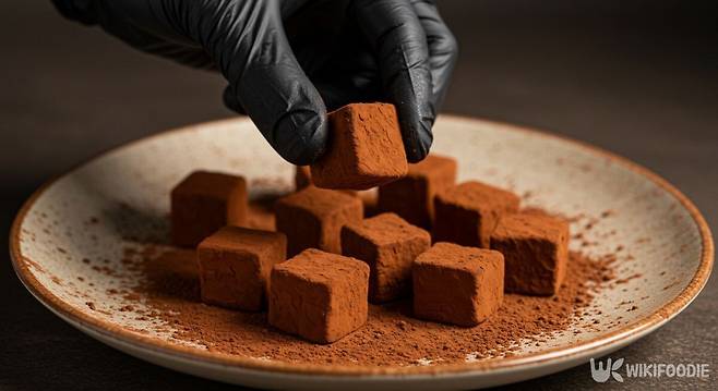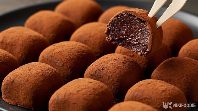 완성된 초콜릿 반죽은 랩을 깐 접시에 올려 평평하게 담는다. 다시 랩을 덮어 모양을 정리한 뒤, 냉동실에 넣어 40분간 굳힌다. 굳은 초콜릿은 다른 접시에 깔아둔 코코아파우더 위에 올린다.