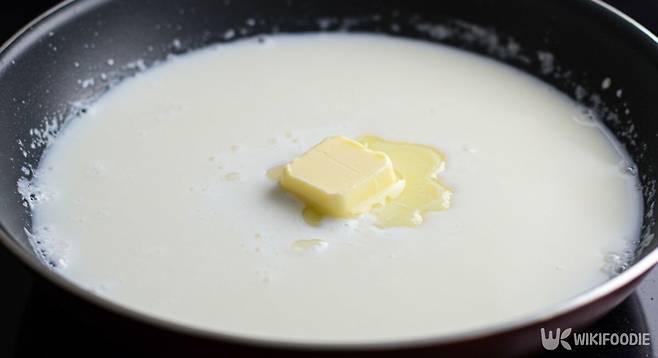 1. 프라이팬에 우유 600ml와 설탕 170g을 넣고 중약불에서 저어 녹인다.