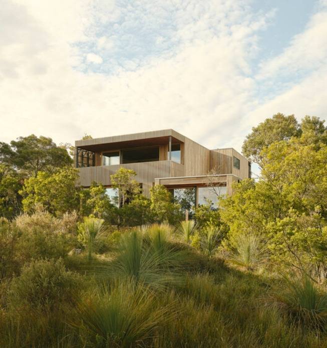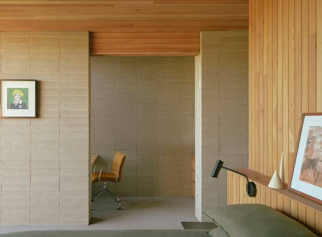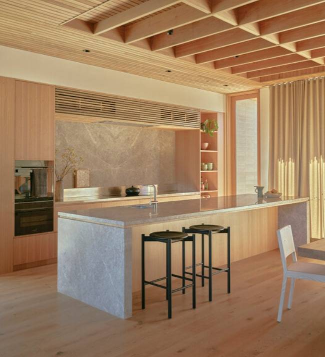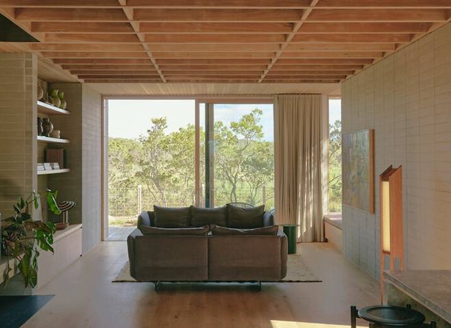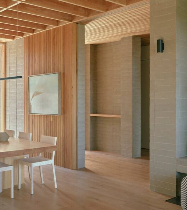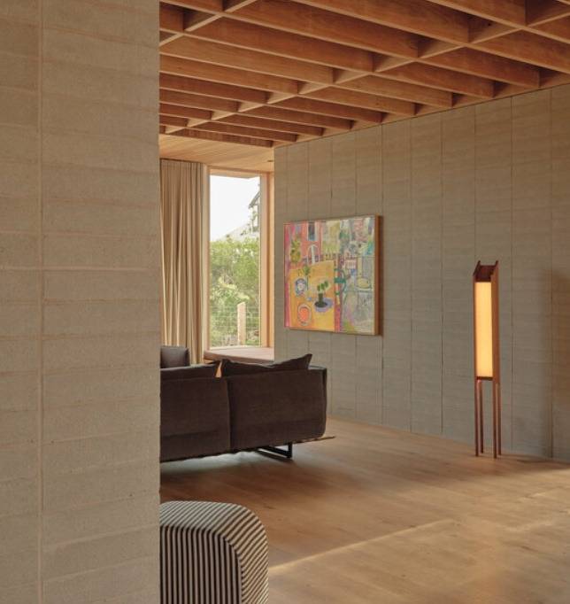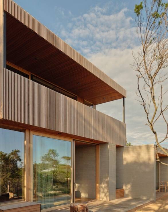 건축물은 절제된 미학을 강조합니다. 견고한 블록 구조의 하층부는 열 저장과 내구성을 제공하며, 밝은 목재로 마감된 상층부는 주변 해안 식물의 색조와 질감을 반영합니다.
