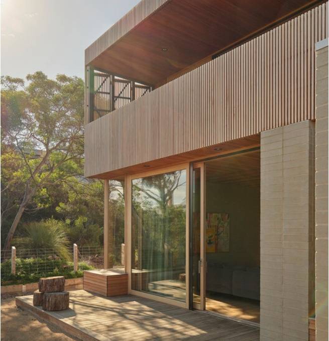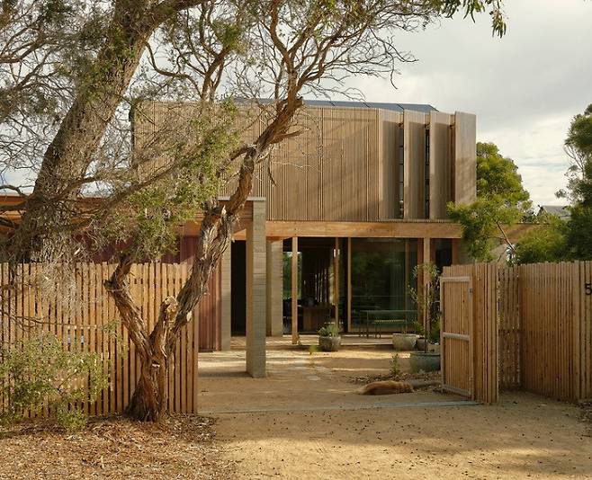건물의 일부를 감싸고 있는 목재 스크린은 지역 식물의 수직적인 리듬을 떠올리게 하며, 실내외의 경계를 자연스럽게 연결합니다. 사용된 자재는 따뜻하고 견고한 느낌을 주어 거주자에게 안정감을 제공합니다.