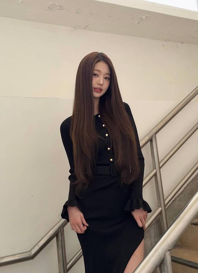 특히 허리 라인을 강조한 핏과 길게 떨어지는 스커트 라인은 우아한 분위기를 배가시켰다. 마치 2000년 박지윤의 ‘성인식’ 무대 의상을 보는 듯 하다. 여기에 자연스럽게 흘러내린 긴 생머리로 청순함과 성숙미를 동시에 자아냈다. 과하지 않은 메이크업과 절제된 포즈 역시 시선을 끌었다. 계단을 배경으로 한 컷에서는 모델 같은 비율과 여유로운 표정으로 화보 못지않은 아우라를 발산했다.