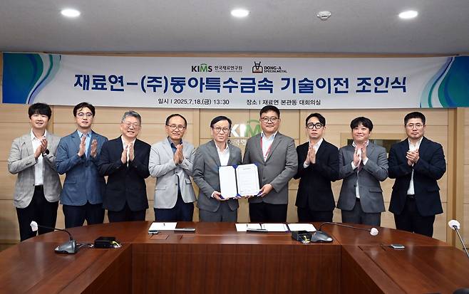 (기술이전 협약서를 들고있는 왼쪽 한국재료연구원 최철진 원장, 오른쪽 동아특수금속 노윤경 대표)