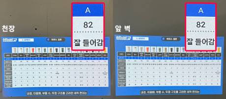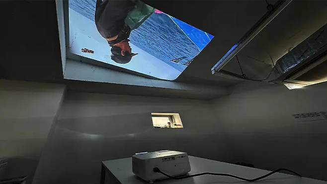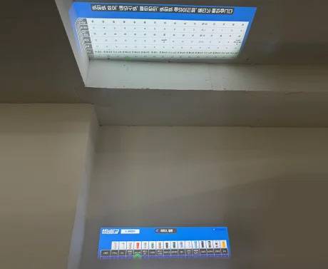벽면에 쏜 화면과 거울을 통해 천장에 쏜 화면을 비교해 보겠습니다.
