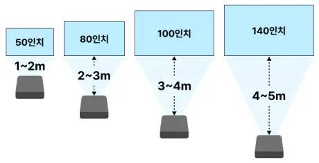 따라서, 이 거리가 확보되지 않으면 큰 화면을 즐기기 어렵기 때문에, 구매 전 사용할 장소에 충분한 투사 거리가 확보되는지를 확인해야 합니다.