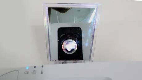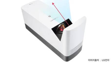 백라이트가 쏜 빛이 렌즈를 통해 나가며 스크린에 비치는 것이 빔프로젝터의 기본 작동 원리인데, 초단초점 빔프로젝터는 렌즈 앞에 거울을 놓아 빛이 꺾이는 각도를 조절하고, 투사거리를 짧게 할 수 있는 것입니다.