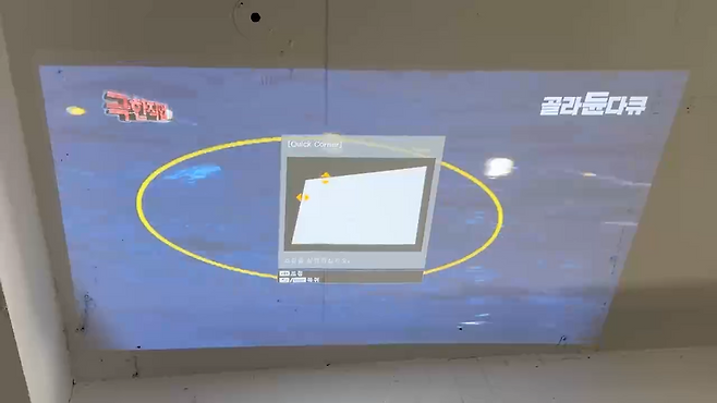 또 거울 각도에 따라 화면이 사다리꼴로 투사될 수 있으니 키스톤 조절을 통해 직사각형 모양으로 맞춰주는 작업도 진행하면, 손쉽게 천장에 빔프로젝터 쏘기 완성입니다.