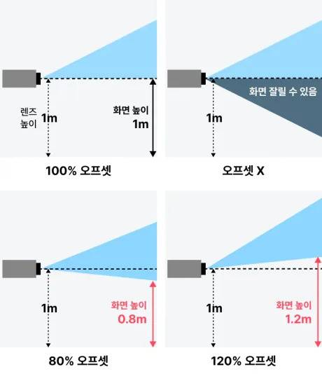 예를 들어, 동일한 1m 높이에서 투사하더라도 A 제품은 바닥 높이 0.8m, B 제품은 1m로 서로 다른 높이에 화면이 맺히는 건데요.프로젝터 렌즈 높이와 투사 화면 아래 면 높이의 비율을 오프셋이라고 하는데, 일반적으로 고가의 제품일수록 오프셋 비율이 큽니다.