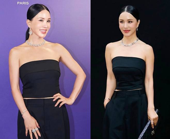 엄정화가 블랙 튜브톱과 와이드 슬랙스로 시크하면서도 고급스러운 패션을 선보였습니다.